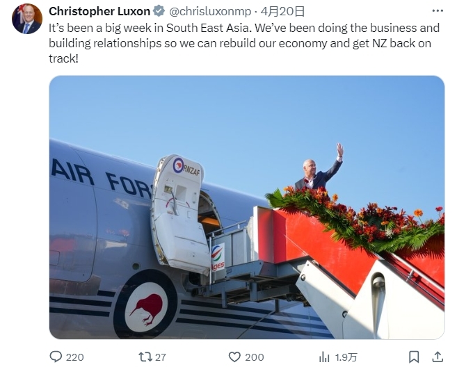 (观察者网讯)综合新西兰中文先驱网、澳大利亚联合通讯社等22日报道,刚对东南亚三国完成国事访问的新西兰总理拉克森(Chris Luxon),在记者会上提到未来该国在亚洲的经济合作部署时表示,他希望加强与台湾地区的贸易联系,但出于尊重“一个中国”政策的考虑,他明确表态称排除在任期间对台湾地区进行访问的可能性。